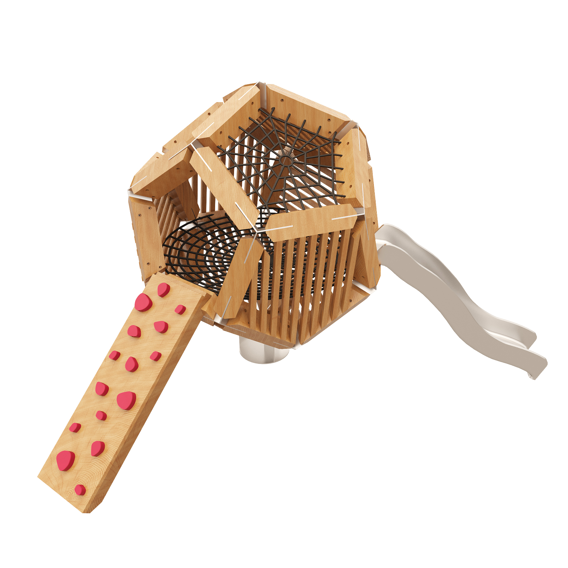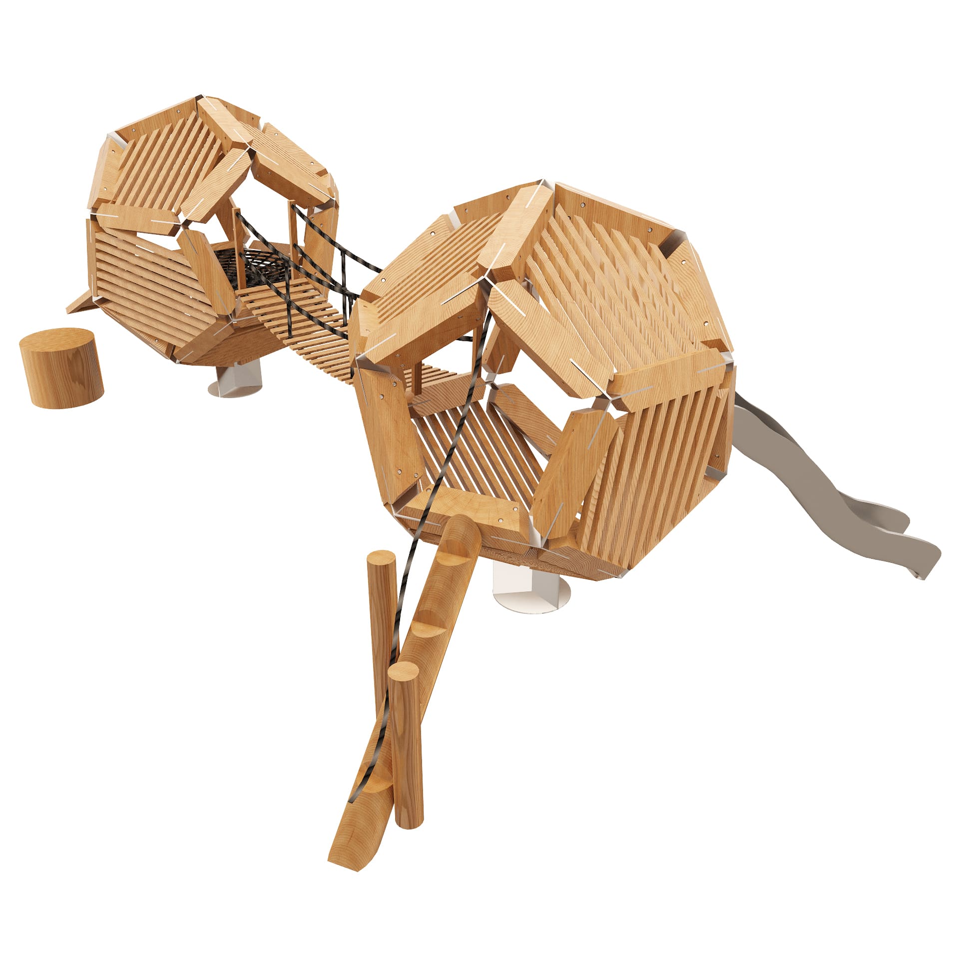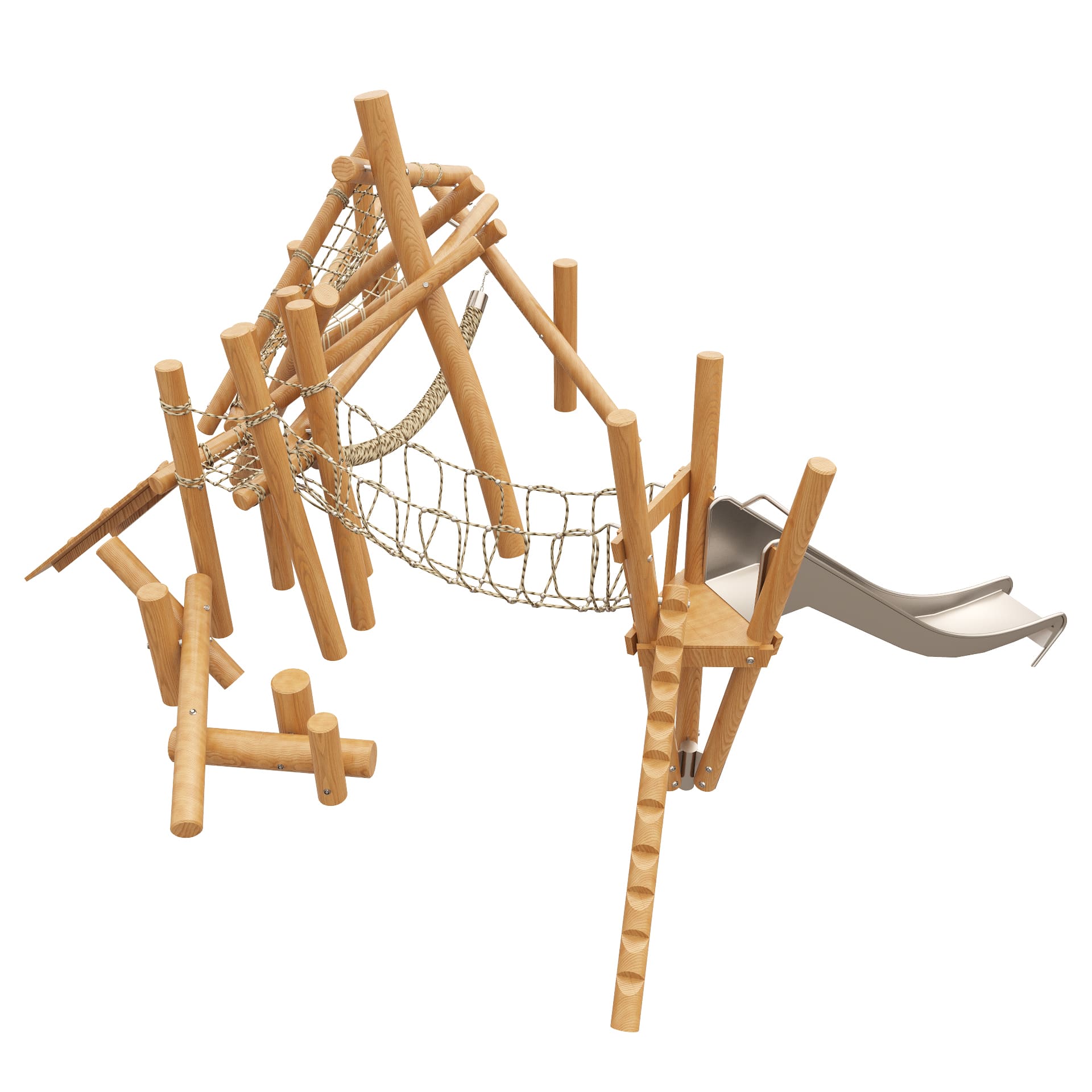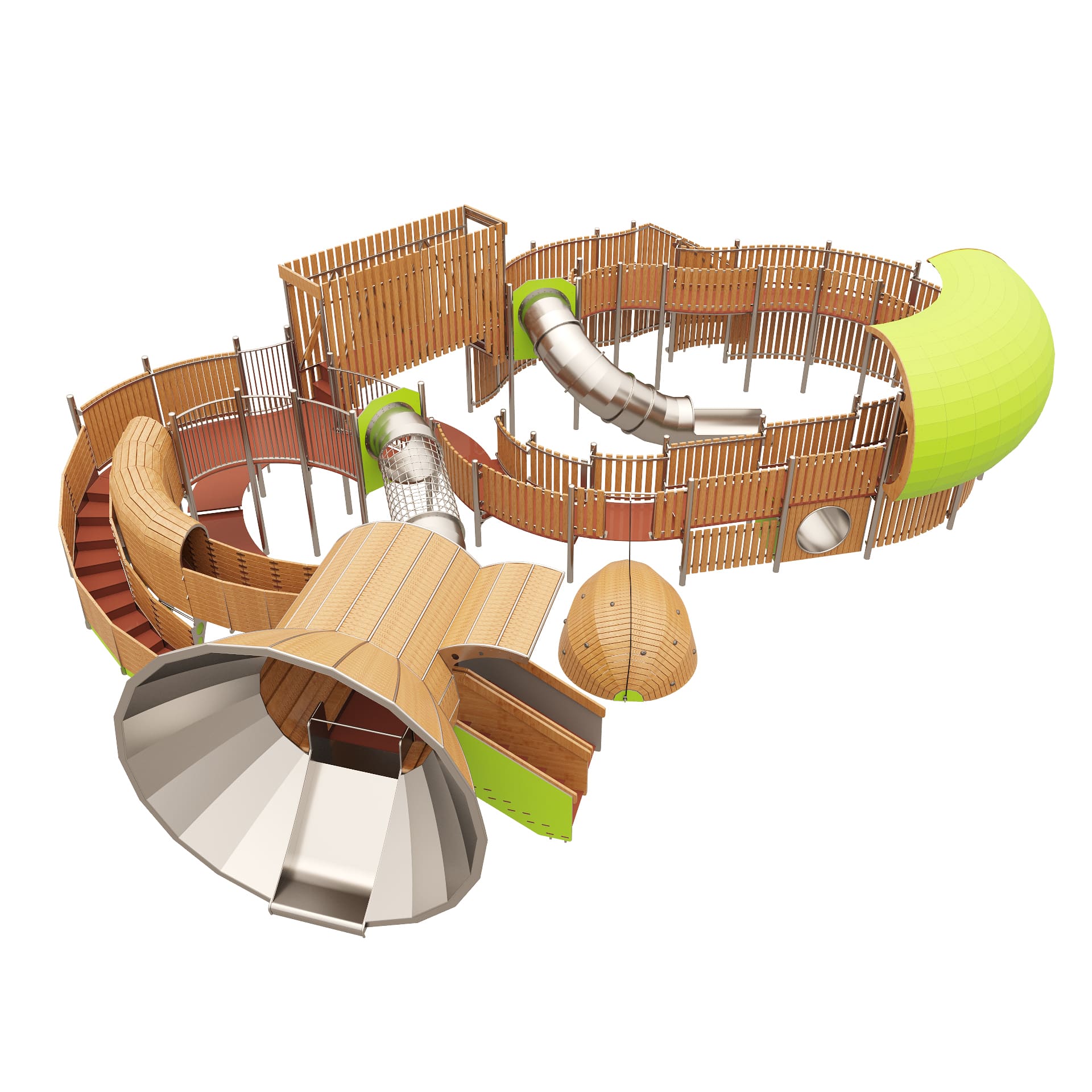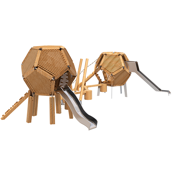 - Уникальный дизайн. Экологические игровые элементы выглядят органично в любом окружении — парке, дворе или детском саду. Разнообразие конфигураций создает неповторимый облик площадки. Горки разной высоты, качели, лазы, мостики — каждый ребенок найдет занятие по душе.